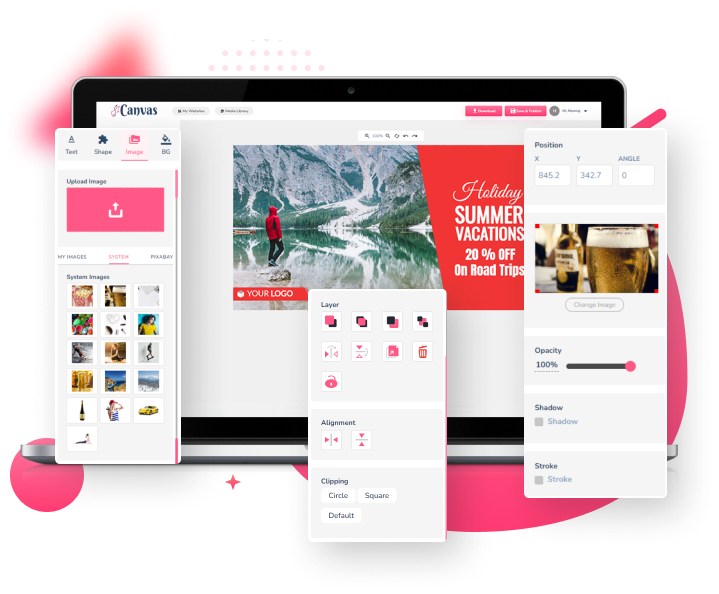 Canvas's Image Option Tool Lets You Upload Your Own Images And Access A Massive Library, Including Pixabay Integration For More Options. You Can Crop, Resize, And Add Special Effects Like Opacity, Shadow, And Stroke. Create Stunning Visuals That Leave Your Audience In Awe With Endless Possibilities Using Canvas's Image Options.